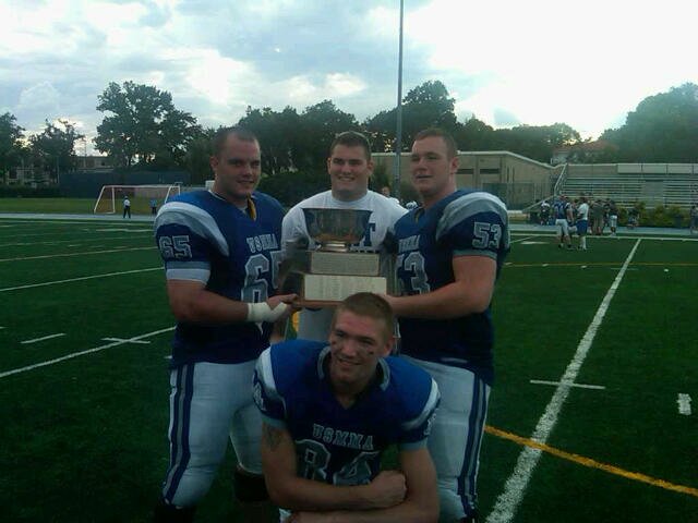 Pictured with the Trophy Cup: #65 Ben Runchey ’14, #53 Dan Leach ’14 (Edgewater, MD), #84 Chase Dunn ’14 & #72 Dan Pierce ‘14 (injured not in game gear)